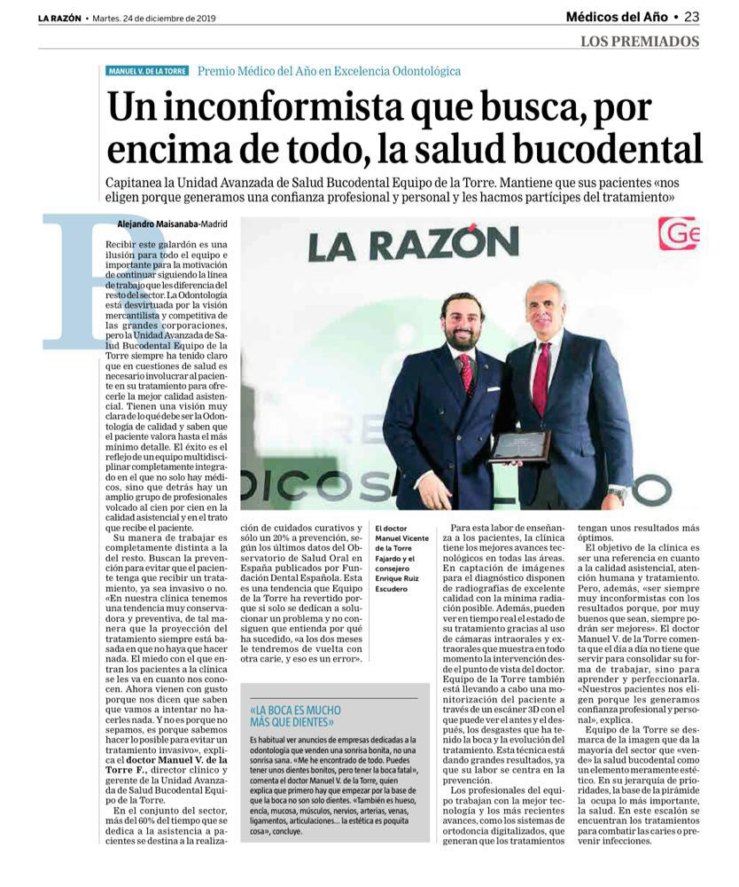 Tantos años de esfuerzo se han visto recompensados con la fidelidad de nuestros pacientes y han hecho posible que el Dr. Manuel V. de la Torre Fajardo, director médico de nuestra unidad, haya recibido el Premio al Odontólogo del Año en la gala de los Premios al Médico del Año organizada por el periódico La Razón, cuyo galardón fue otorgado por el Consejero de Sanidad de la Comunidad de Madrid, Enrique Ruiz Escudero.